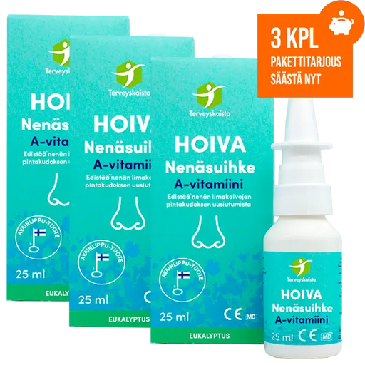 Katso kaikki tiedotTerveyskaista HOIVA® A-vitamiini Nenäsuihke 25 ml 3 kpl PAKETTITARJOUS!