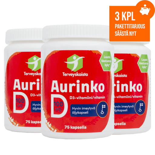 Katso kaikki tiedotAurinko D-vitamiini 100 µg (75 kaps.) 3 kpl PAKETTITARJOUS!