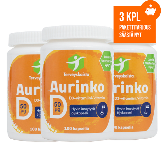 Katso kaikki tiedotAurinko D-vitamiini 50 µg (100 kaps.) 3 kpl PAKETTITARJOUS!
